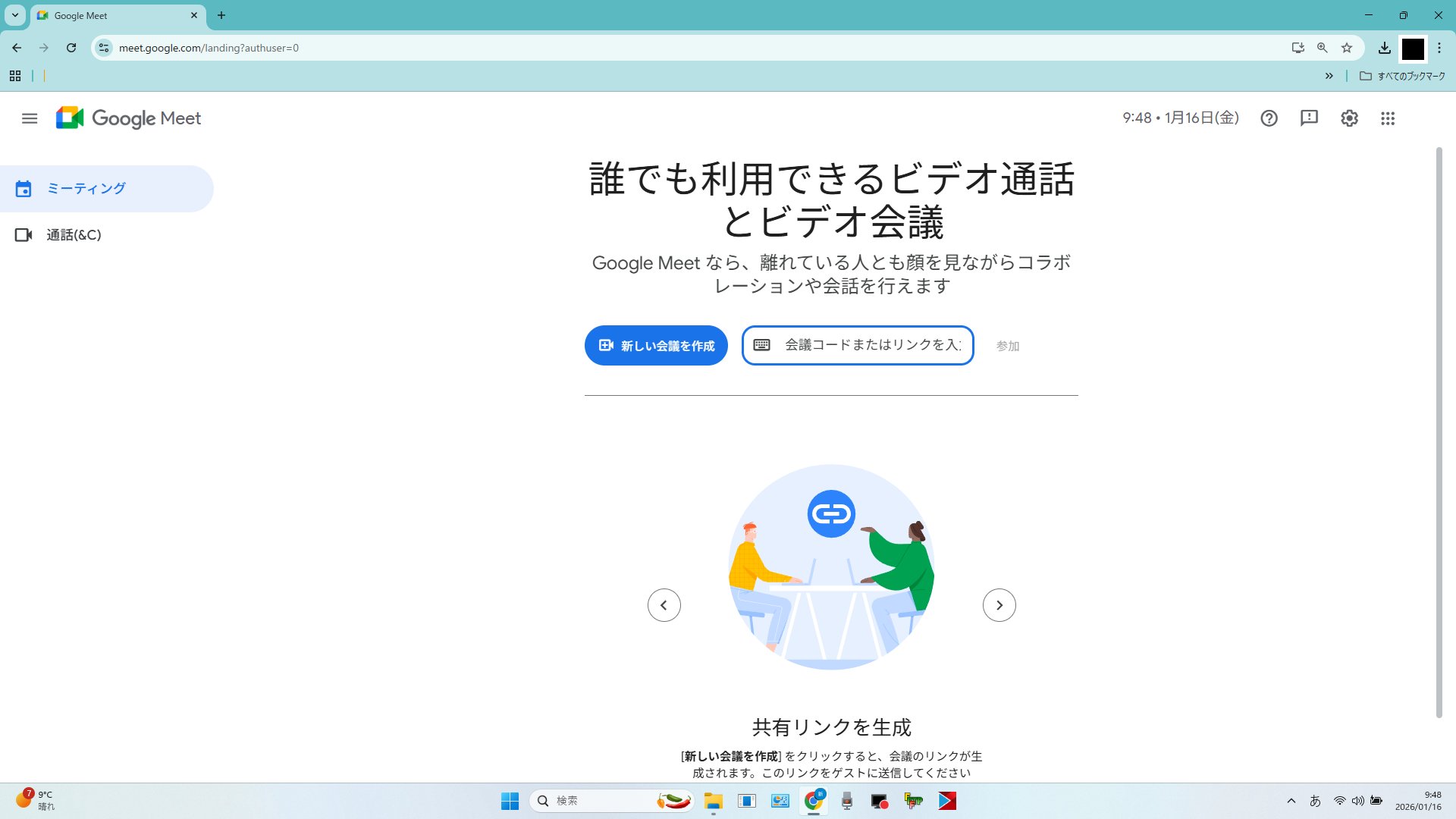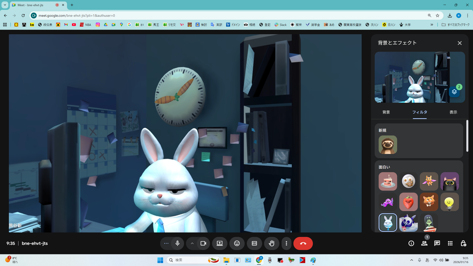グールグミートとはGoogle社が提供するオンライン会議システムです。左がログイン画面で、主催者が設定した会議コードを入力します。右がログイン後の画面で、会議中を実施しているところです。自分の姿や背景を他のものに変更することができます。このサンプルでは、自分の姿をうさぎに変えて、背景を暗室にしています。